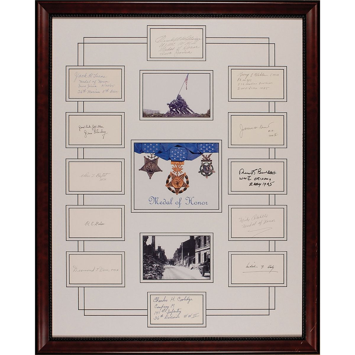 Ink and felt tip signatures of 12 recipients of the Congressional Medal of Honor for service during World War II, each on an off-white 5 x 3 card. Signers are: Hershell Williams, Jack Lucas, George Wahlen, James Burt, Robert Bush, Mike Colalillo, Michael Daly, Charles Coolidge, Desmond Doss, R. E. Galer, Van Barfoot, and Eugene Fluckey. All are nicely double matted and framed with three photos, one of the award itself, one of the Iwo Jima monument and one of the allies in Normandy, to an overall size of 24.5 x 30.5. In fine condition. Oversized.