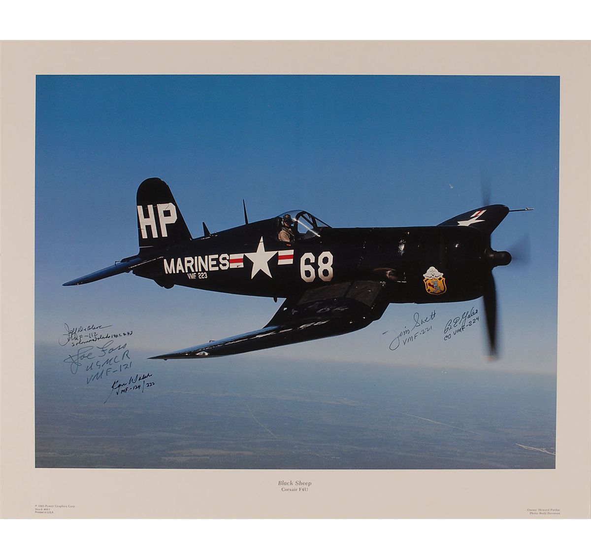 Color 20 x 15.75 poster of a Black Sheep Corsair F4U, signed in black ink and felt tip by five Marine Corps Medal of Honor recipients: Jeff DeBlanc, Joe Foss, Ken Walsh, Jim Swett, and R. E. Galer. In fine condition, with some scattered light surface marks.
