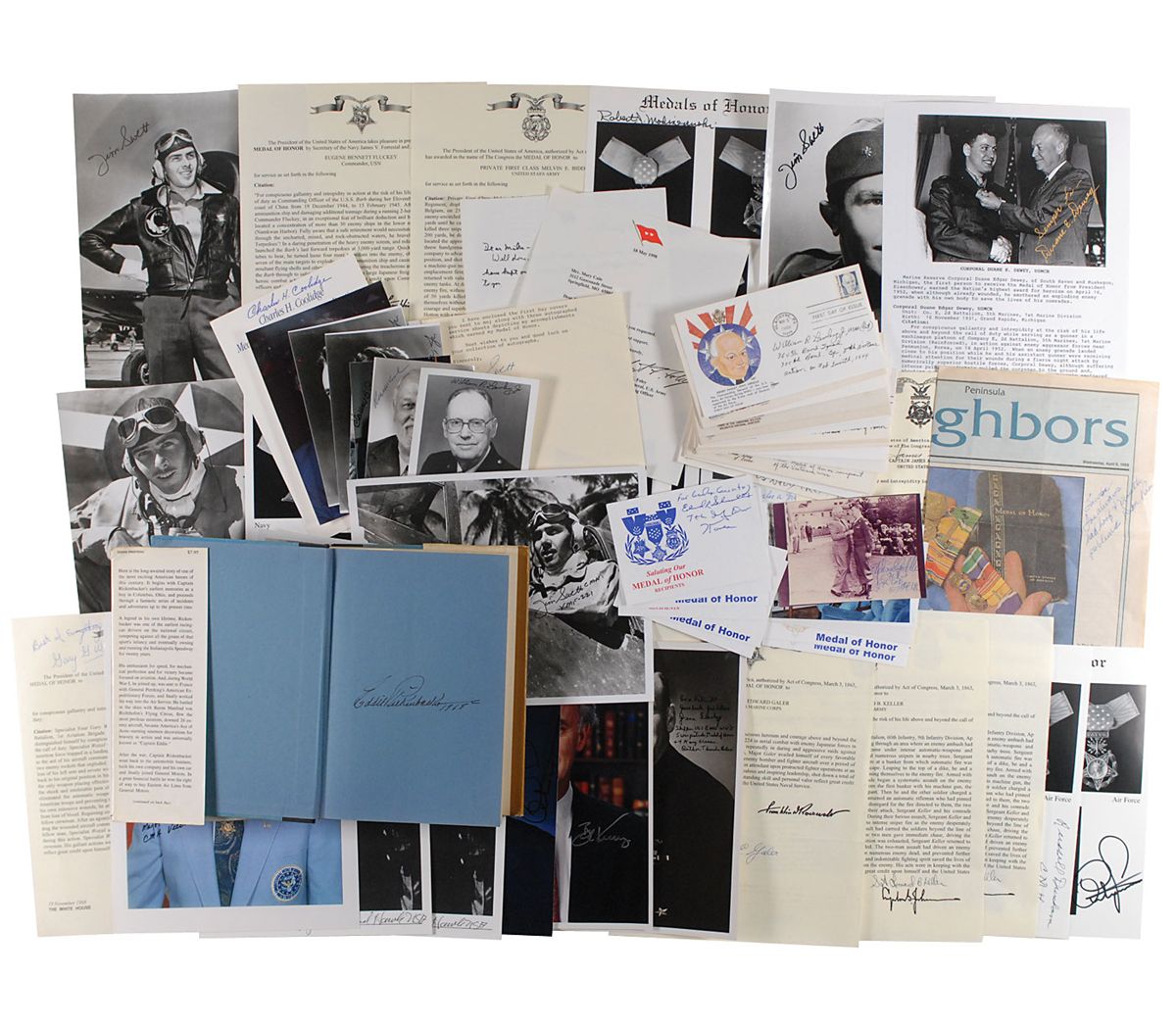 Collection of 100 items consisting of signed photos, souvenir citations, biographies, cards, covers, letters, business cards, programs, and a book, each signed in ink or felt tip by a different Medal of Honor recipient. Signers include: Eddie Rickenbacker, Richard O’Kane, David McCampbell, Ken Walsh, John Tominac, James Stockdale, James Bulkeley, Robert O’Malley (2), Jacklyn Lucas, Beryl Newman, Walter Ehlers, Robert Nett (2), Michael Novosel, Vernon Baker, Nicholas Oresko, Roger Donlon, Jay Vargas, Bud Day, Lucian Adams, Robert Galer (2), Joe Foss, Robert Simanek, Leo Thorsness, Desmond Doss, Bob Kerrey (3), Hiroshi Miyamura, Robert Howard (2), Oscar Johnson, Mitchell Paige (2), Robert R. Ingram, Edward Schowalter, Raymond Murphy, Ola Mize, Rudy Hernandez, Bernie Fisher, Bob Maxwell, Charles Coolidge (2), Don Ross, Lewis Millett, William Lawley (2), Stephen Gregg, Jay Zeamer (3), Ernest Childers (3), Francis Currey, Silvestre Herrera, Vernon McGarity, William McGonagle, Michael Fitzmaurice, John Crews (2), William Crawford (2), Roy Benavidez, James Hendrix, Webster Anderson, Richard McCool, Melvin Biddle (2), Clarence Craft, John Hawk (3), Paul Wiedorfer (2), Michael Daly, Jim Swett (5), James Taylor (2), Peter Lemon (2), Eugene Fluckey (3), Gary Wetzel, Leonard Keller (2), Duane Dewey, Russell Dunham, Sammy Davis, Arthur Jackson, Robert Modrzejewski, Robert Foley, Charles MacGillivary, Charles Murray, Jose Lopez, and George Wahlen. In overall fine condition.