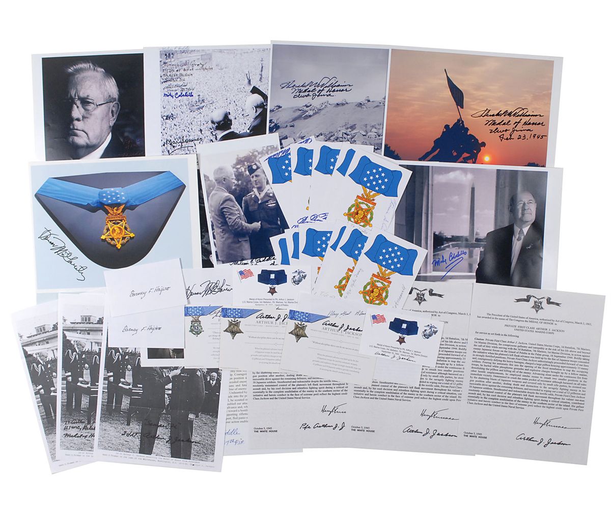 Collection of 38 items, consisting of signed photos, signatures, and copies of citations, each signed by a Medal of Honor recipient. Signers are: Van T. Barfoot (3); Melvin E. Biddle (2); Mike Colalillo; Francis S. Currey (2); Barney F. Hajiro (3); Arthur Jackson (11); Robert Maxwell (3); Vernon McGarity (4); Charles P. Murray (2); Hershel Williams (6); and Melvin Biddle, Van Barfoot, Francis Currey, and Mike Colallio. In fine condition.