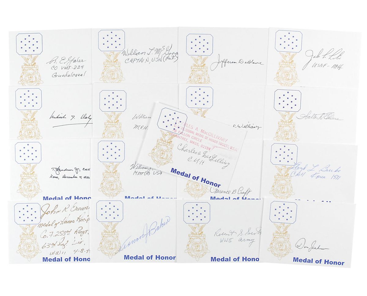 Ink and felt tip signatures of 17 Medal of Honor recipients on individual 5 x 3.5 white cards, each bearing an image of the medal. Signers are: Walter Ehlers, Michael Daly, James Williams, Robert Scott, Charles MacGillivery, William McGonagle, John Levitow, William Lawley, Dan Jenkins, Thomas Hudner, R. E. Galer, Jefferson LeBlanc, John Crews, William Crawford, Clarence Craft, Lloyd Burke, and Vernon Baker. In fine condition.