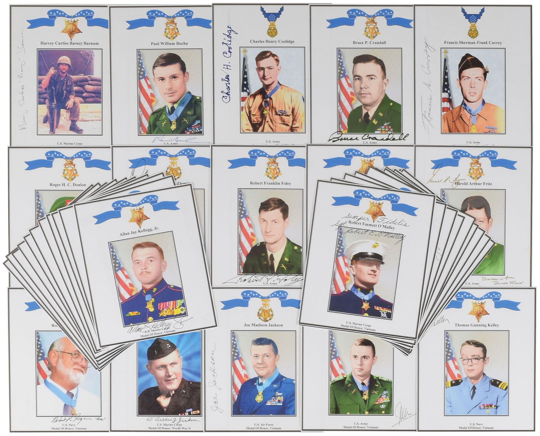 Impressive collection of 40 color laserprint photos of Medal of Honor recipients, each approximately 6.25 x 7.5, signed in ink or felt tip by the pictured recipient, including: Harvey C. Barnum Jr.; Paul Bucha; Charles H. Coolidge; Bruce P. Crandall; Francis S. Currey; Roger Donlon; James P. Fleming; Robert F. Foley; Wesley L. Fox; Harold A. Fritz; Robert R. Ingram; Arthur J. Jackson; Joe M. Jackson; Jack H. Jacobs; Thomas G. Kelley; Allan J. Kellogg; Bob Kerrey; Thomas James Kinsman; Howard V. Lee; Gary L. Littrell; James E. Livingston; Allen James Lynch; Walter Joseph Marm, Jr.; Robert D. Maxwell; Hiroshi H. Miyamura; Ola L. Mize; Robert J. Modrzejewski; Robert Emmett O'Malley; Robert Martin Patterson; Ronald E. Ray; Gordon Ray Roberts; Wilburn K. Ross; Ronald E. Rosser; George T. Sakato; Clarence Sasser; Robert E. Simanek; James Allen Taylor; Jay R. Vargas; Ernest E. West; and Hershel W. Williams. In overall fine to very fine condition.