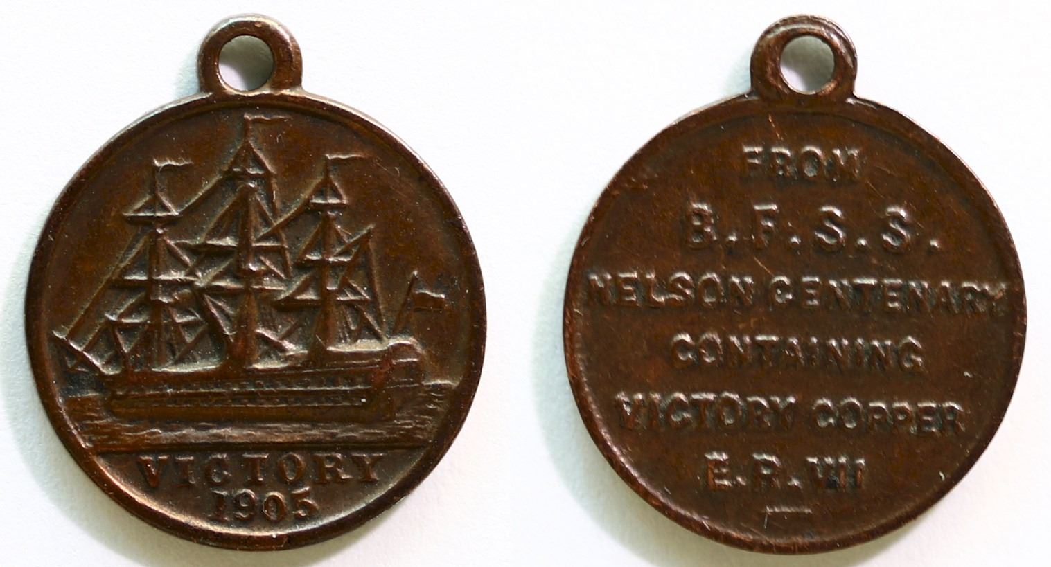 Medalet; 1905 "HMS Victory" medalet with loop; Depicts the Victory. FROM/ B.F.S.S./ NELSON CENTENERARY/CONTAINING/VICTORY COPPER/E.R. VII. Copper. This is a rarer version of the 17mm medalet showing the port broad on the obverse