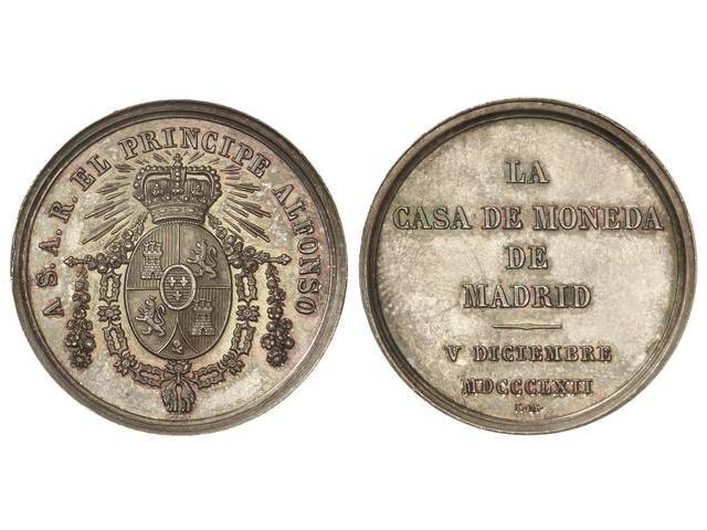 Medalla. 1862. VISITA DEL PRÍNCIPE ALFONSO CASA MONEDA. MADRID. Anv.: A.S.A.R. EL PRÍNCIPE ALFONSO. Rev.: LA CASA DE MONEDA DE MADRID. 9,14 grs. AR. Ø 26 mm. V-440. SC.