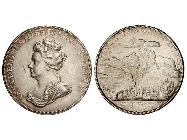 Medalla Captura de Vigo. 12 Octubre 1702. GRAN BRETAÑA. Anv.: ANNA.DEI.GRA.MAG.BR.FRA.ET.HB.REGINA. Busto a izquierda. Rev.: CAPTA.ET.INCENSA.GAL.ET.HISP.CLASSE. En exergo: AD.VIGVM.XII.OXT.MDCCII. Busto de Vigo quemando. AR. Ø 37 mm.