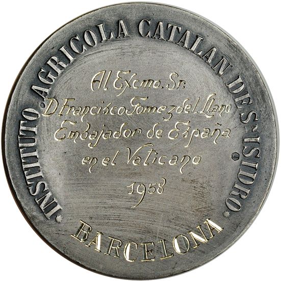 Medalla. Instituto Agrícola Catalán de San Isidro. Concendida al embajador en el Vaticano D. Francisco Gómez del Llano en 1958. AR 60 g. Ø 51 mm. En estuche. SC.