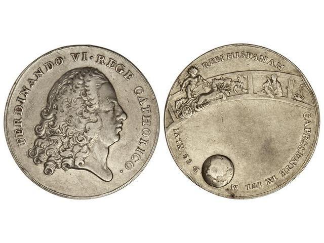 Medalla Proclamación. 1746. MADRID. Anv.: FERDINANDO VI REGE CATHOLICO. Rev.: REM HISPANAM CAPESSENTE. El Sol en la banca zodiacal, la Tierra al fondo. 19,20 grs. AR. Ø 34 mm. (Golpecitos). He-17. MBC+.