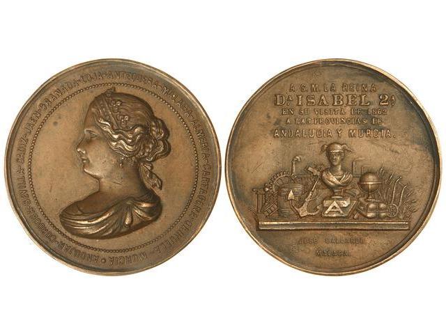 Medalla Visita de Isabel II a Murcia. 1862. Anv.: Busto de Isabel II a izquierda. Rev.: Busto de Mercurio rodeado de atributos. AE. Ø 50 mm. MBC.