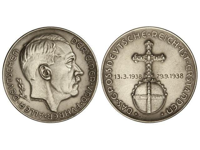 Medalla a Adolf Hitler. 29.9.1938. Anv.: .DAS.GROSSDEUTSCHE.REICH.EST.ERSTANDER. Cruz sobre orbe. Rev.: DER.EINER.VND.FVHRER.ALLER.DEVTSCHEN. Busto de Hitler a derecha. AR. Ø 35 mm. (Pequeñas rayitas en anverso). EBC+.