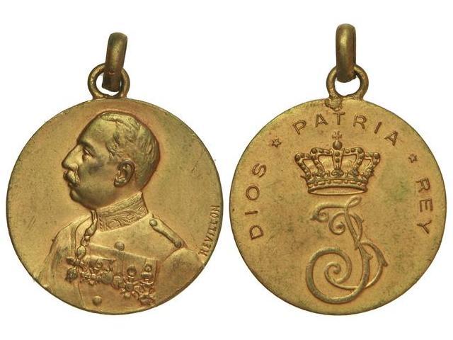 Medalla de Don Jaime en Categoría de Oro. - Anv.: Busto de Don Jaime a izquierda. Rev.: Cifra J3 coronada, encima DIOS PATRIA REY. Metal dorado. Anilla y contrananilla originales. PG-1052. EBC+. - -