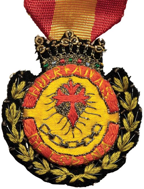 Medalla de distinción. Tela bordada, manteniendo los tipos de la Hermandad de Cautivos por España, con la ley: HUERFANAS DE ESPAÑA. G-no. SC. Rara.
