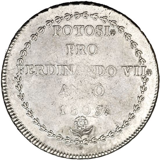 Medalla de proclamación. 1808. Potosí. Módulo 8 reales. H-50. Acuñación floja en el anv. y golpecito en la gráfila. Pequeñas muescas. MBC+.