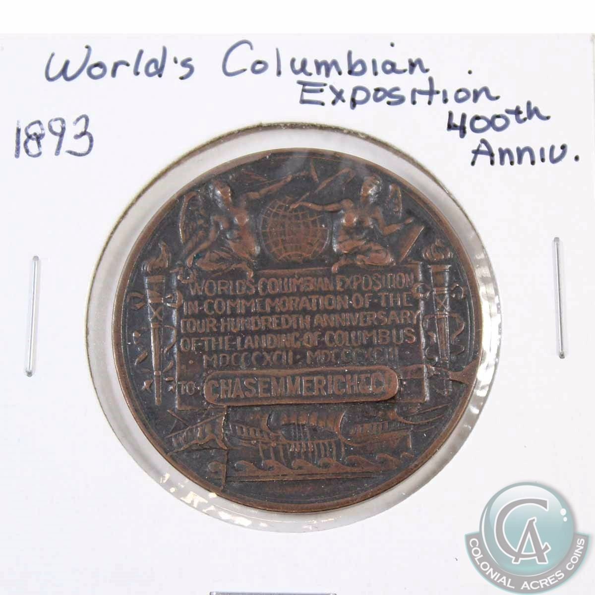 Medallion: 1893 World Columbian Exposition Award Medallion. By Augustus Saint Gaudens (obv) and Charles E. Barber. Awarded to Chase Emmerich & co. This Medal is 39mm diameter.