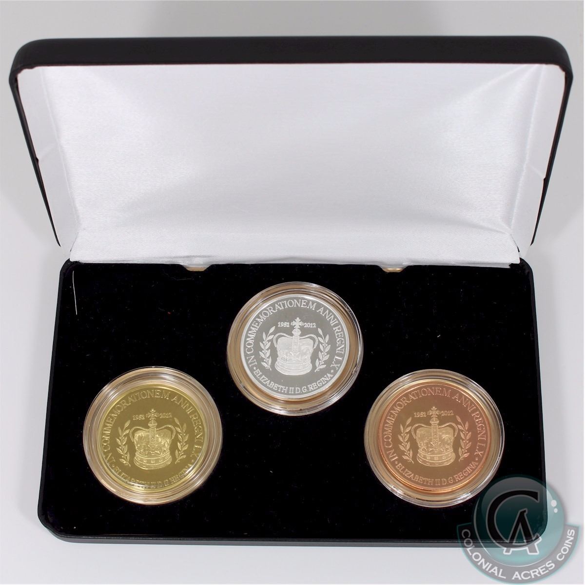 Medallion: 1952-2012 Royal Canadian Numismatic Association 3-coin Silver, Brass & Copper Set Commemorating HM Queen Elizabeth's 50 years as reigning Monarch. The Silver coin weighs 46.9 grams, Copper 40.7 grams and the Brass weighs 39.1 grams. Each coin is approximately 44mm in diameter.