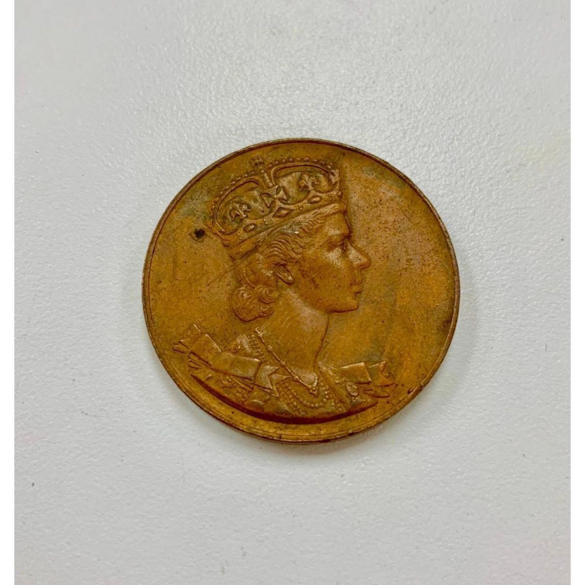 Commemorative issue Coronation of Queen Elizabeth II Obverse Crowned effigy of Queen Elizabeth II, in a high-collared ermine cloak and wearing the collar of the Garter and Badge of the Bath, and facing right. There is a raised rim but no legend. Reverse The reverse shows the Royal Cypher EIIR surmounted by a large crown. The legend around the edge reads QUEEN ELIZABETH II CROWNED 2nd JUNE 1953. There is a raised rim. Lettering: ELIZABETH II REGINA CORONATA MCMLIII E II R CANADA Edge Smooth Specifications Country: * Tokens * (Canada - Souvenir Tokens) Type: Token Year: 1953 Currency: Souvenir Tokens Composition: Bronze Weight: 17.5 g Diameter: 33.4 mm Shape: Round