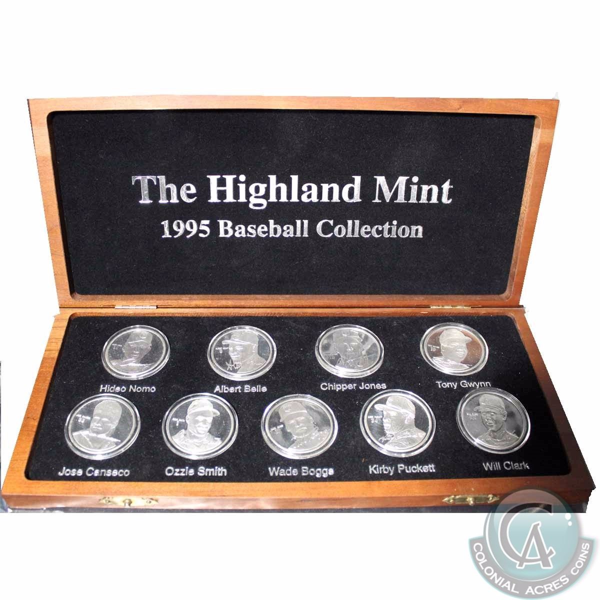 This Nine coin Commemorative matched set is one of only 500 Ever to be Minted. The first 500 Medallions of each player from the original Mintage was reserved for this unique set. Each Medallion is made of 1 troy oz of .999 Fine Silver. the players depicted on each Medallion represents the nine Medallion produced in 1995 by the Highland Mint. Players are as follows: Hideo Nomo, Jose Canseco, Albert Belle, Ozzie Smith, Wade Boggs, Chipper Jones, Kirby Puckett, Tony Gwynn (Coins are toned and capsules scuffed)