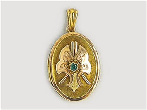 14 K gold, oval detachable locket, applied decoration, 1 green glass bead decoration, circa 1900, marked, weight: 7.9 g, dented.