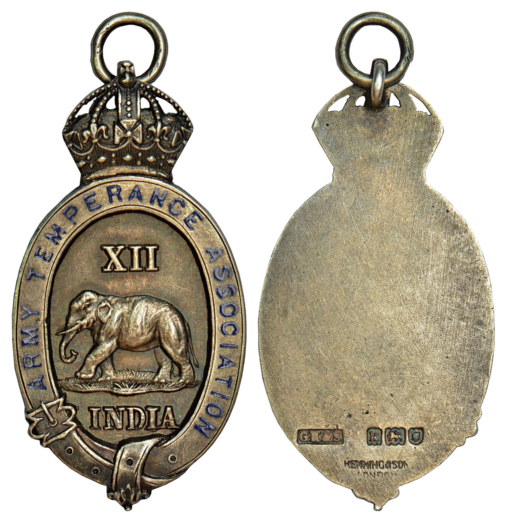 British India, Army Temperance Association, oval shape silver medal, 15.11g. Obv: Elephant in center, with INDIA below and Roman XII above, crown at top and inscription around ARMY TEMPERANCE ASSOCIATION in blue enamel. Rev: GK&S London (Kennin & sons), hall mark.