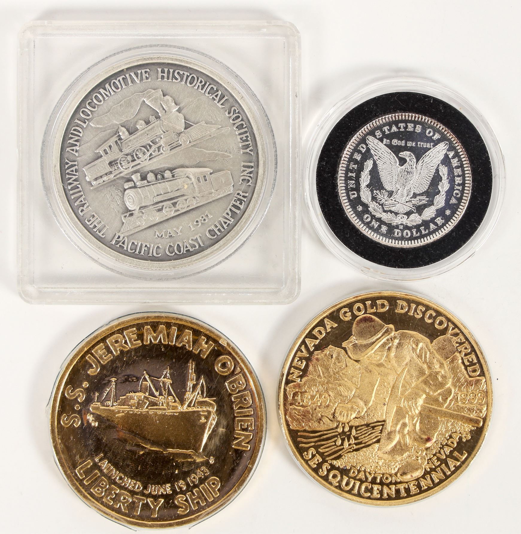 Four miscellaneous medals: 1) miniature 1883-CC Morgan dollar replica, DCPL in hard plastic case; 2) The Railway and Locomotive Historical Society Pacific Coast Chapter California State Railroad Museum May 1981; 3) Nevada Gold Sesquicentennial Dayton Nevada; 4) U. S. S. Jeremiah O'Brien Liberty Ship D-Day Normandy gold plated medal.