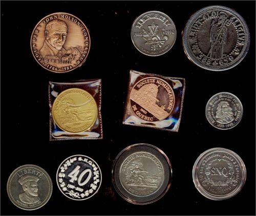 Medals, Lot of 10 various medal / Tokens in various base medals and quite intriguing as lot. Includes a Boucherville Silver Trade Dollar, a St. Eloi medal a couple SNQ medals silver and copper as well as a few others. Amust see.