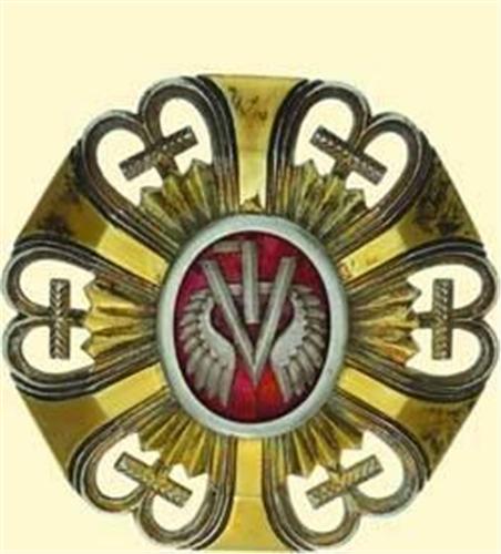 Breast Star 1st class; silver gilt, thin stamped silver sheet with profile on reverse, cut out construction, central medallion with red enamel background and silver parts; thin pin and two small side hooks on reverse; size 72,5 x 70,5 mm; small signs of wearing. Very attractive decoration of unusual modern design in very fine condition!