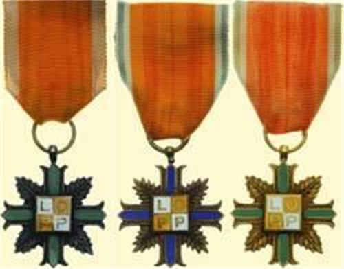 Air Defence League - LOPP - Cross 1925; lot of three breast badges: golden-, silver- and bronze badge, all bronze gilt or silver plated and patinated, or bronze; obverse partially enamelled (1st and 2nd class wit green cross, 3rd class with blue cross), reverse blank, diam.: 36-37 mm; with original ribbons.