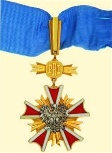 Commander's Decoration; neck badge, bronze gilt, obverse partially enamelled, superimposed eagle silver plated, with "PRL"-emblem above and original suspension loop and ribbon. Fine solid quality in near best condition!