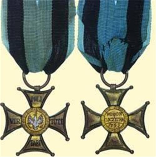 Golden Cross (4th class) - Type 1918-1939; breast badge, bronze gilt, partially enamelled, reverse with stamped number (523), flat one part version with large suspension ring and ribbon with metal bar. Significant signs of wearing and cleaning!