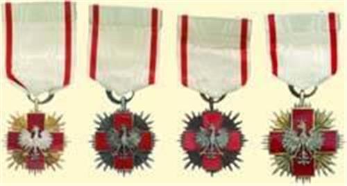 Lot of Four Medals 1923; breast badges, 1) large version, diam.: 43 mm, silver gilt; 2) small version, diam.: 36,6 mm, silver gilt; 3) small version, diam.: 37 mm, silver; 4) small version, diam.: 36,7 mm, bronze; all obverse partially enamelled, reverse with inscriptions: "P.C.K. Zasludze", with wreath suspensions and original ribbons with pin bar.