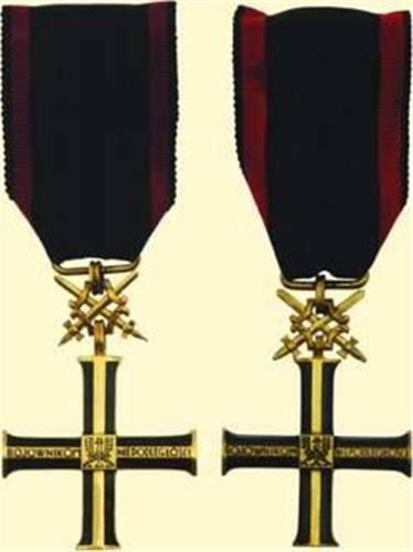 Lot of Two with Swords; breast badges, different versions, bronze gilt, partially enamelled and polished, diam.: 40,6 and 39,4 mm; with crossed swords above, different types of suspensions; with original ribbons. Excellent design and quality! Only ca. 1800 crosses with swords were awarded!