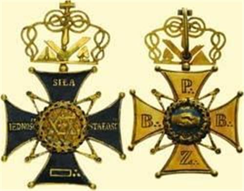 Masonic Badge; neck- or breast badge, cast brass gilt, obverse black enamelled, reverse remains of blue colour in centre medallion, with symbolic ornamental suspension, size 49 x 75 mm (including suspension); inscription on obverse "SILA - IEDNOSC - STALOSC" (= energy - equality/unity - permanency); very fine old quality from first half of 19th century, very rare and important Polish masonic item! (Wesolowski - Fig. 1199 - wrongly described this badge as "Jewish Confederation Cross - 18th century").