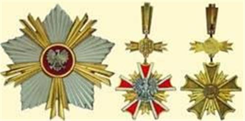Grand Cross - Set; sash badge, bronze gilt, obverse partially enamelled, superimposed eagle silver plated, with "PRL"-emblem above and original suspension loop; heavy solid quality! Breast Star, bronze silver plated, obverse partially gilt, medallion enamel-lacquered, with narrow pin on reverse; heavy solid quality! Small signs of wearing.
