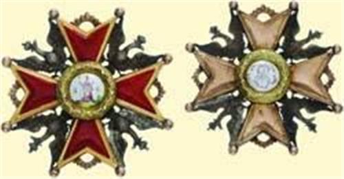 Order's Cross (3rd class) - II. Type; sash badge 3rd class, gold cross enamelled, with painted medallion and crowned silver eagles in angles between arms; reverse blank, painted medallion "SAR"; garlands on outer edges of the arms; size 41,5 x 41,1 mm, weight 12,4 gramme. Small signs of wearing and age. Excellent old quality, from first half of the 19th century in nearly best condition! Very attractive and very rare!