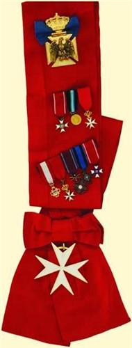 Personal Group of Ten; sash badge similar to Maltese Cross (metal gilt and lacquered, diam.: ca. 78 mm) with complete new red sash. Mounted on top of sash an unknown society badge (masonic ?) with eagle and crown, metal gilt with blue bow and two miniature groups (mounted on sash): 1) Order Polonia Restituta - Cross 1918, Phillippus of Araucania - Medal, Phantasy Maltese Cross. 2) Order Polonia Restituta - Cross 1918, Virtuti Militari Cross 5th class 1918, Golden Cross of Merit with Swords 1942, Phantasy Maltese Cross, American Red Cross Badge. Some fine miniatures, the rest of low quality and unofficial!