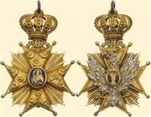 Chapter's Cross; sash- or neck badge, bronze and silver gilt, obverse white eagle enamelled, both medallions are blue enamelled (with grain sheaf and St.Maria), with workmanship from 18th century, with signs of wearing. Very attractive and rare! (see also WESOLOWSKI, Polish Orders, Medals,...p.11ff.)