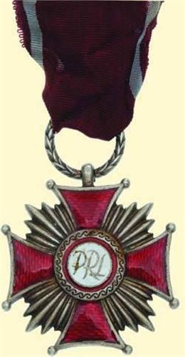Silver Cross (2nd class) - IV. Type (People's Republic); breast badge, bronze silver plated, obverse enamelled, medallion "PRL", reverse blank, with wreath suspension and original ribbon. Signs of wearing.