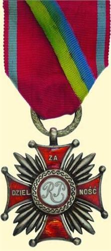 Silver Cross (2nd class) for Bravery - I. Type; breast badge, silver, obverse partially enamelled, with inscription on obverse "ZA DZIELNOSC" (= For Bravery), reverse blank, Polish hallmarked, maker's mark "GW", numbered "139", with wreath suspension and original ribbon with blue-yellow cross stripe. Enamel damages, signs of wearing. Rare decoration, ca. 380 were awarded!