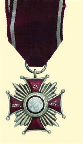 Silver Cross (2nd class) for Bravery - I. Type; breast badge, bronze silver plated, obverse partially enamelled, with inscription on obverse "ZA DZIELNOSC" (= For Bravery), reverse blank, with ring-suspension and later ribbon. Probably a later replacement of lower quality, signs of wearing and testing.