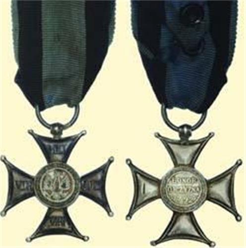 Silver Cross (5th class) - Type 1918-1939; breast badge, silver, partially enamelled, flat one part version, maker's mark on reverse "W. WABINSKI i Ska", with variant loop, suspension ring and old ribbon. Some signs of wearing and enamel damages.
