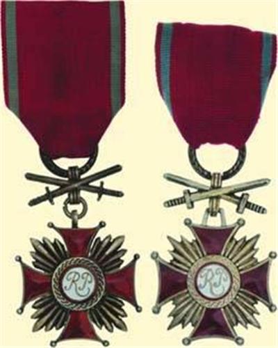 Silver Cross with Swords (2nd class), 1942; lot of two different types; breast badges; 1) silver, cut out rays, obverse enamelled, reverse blank, with connection ring, crossed swords and wreath suspension; 2) bronze silver plated, compact version, obverse enamelled, reverse blank, crossed swords movable between badge and wreath suspension. Both with original ribbons. Small signs of wearing.