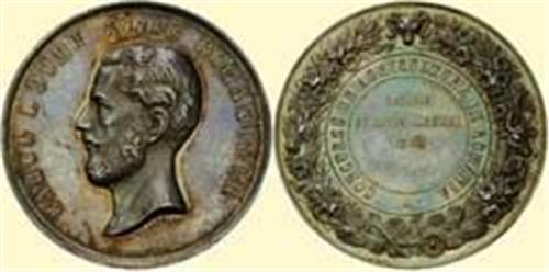 "AGRICULTURAL CONTEST 1878". Silver medal 1878 by Carniol, 58 mm. Bust of Carol Ist threequarters l., "CAROL I DOMN ALLU ROMÂNILOR". Rv. Garland with vines, corn-ears and animal heads, in centre "ONÓRE CULTIVATORULUI 1878", around "CONCURSU DE AGRICULTURÂ IN ROMÂNIA". Buz. p. 240