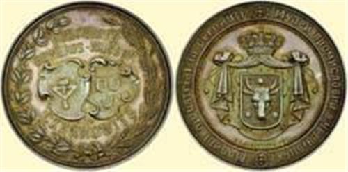 "CERNAUTI INDUSTRIAL MUSEUM". Silver medal hallmarked from about 1900 by C. A. Romstorfer, 46 mm. Obv. Pair of shields with the coat-of-arms of trade guilds, wreath of corn-ear and tree leaves, "BUKOWINER GEWERBE-MUSEUM IN CZERNOWITZ". Rv. Crowned coat-of-arms of Bucovina, around "Museul Industrial în Cernåu¡i", ";J2,6 AD@<4FB@&46 & Q,D>z&PDN". WT. -; Slg. Horsky -. Extremely rare!