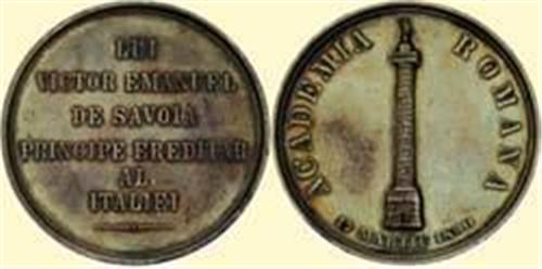 COMMEMORATIVE MEDAL FOR PRINCE VICTOR EMANUEL OF SAVOIA". Silver medal, hallmarked 1890 by P. Telge, 45 mm. Obv. "ACADEMIA ROMÂNA 17 Martiu 1890." Rv. Legend on 6 lines "LUI VICTOR EMANUEL DE SAVOIA PRINCIPE EREDITAR AL ITALIEI". Buz. p. 244