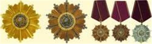 Complete set, 1st - 5th class; 1st and 2nd class Breast Stars with 10 rays reverse with pin back, 3rd - 5th class breast badges with original suspension ring and original ribbon; 3rd class metal gilt, 4th class metal silvered, 5th class bronze.