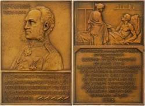 DR. CAROL DAVILA". Bronze plaque 1903 by M & W. St., 70 x 48 mm. Obv. Bust of Dr. Carol Davila three-quarters l., above "DR. C. DAVILA 1828 - 1884", below "ÎN AMINTIREA CREATORULUI SI ORGANISATORULUI STUDIULUI MEDICINEI, FARMACIEI SCOALEI VETERINARE SERVICIULUI SANITAR AL ARMATEI". Rv. Women caring for a patient. Below "COMITETUL PENTRU RIDICAREA MONUMENTULUI GENERAL R. JULIU THEODORY DR. JACOB FELIX GENERAL DR. ZAHARIA PETRESCU DR. CONSTANTIN D. SEVREANU DR. DIMITRIE GRECESCU DR. DIMITRIE DRAGHIESCU DR. FLOREA THEODORESCU ALEXANDRU LACUSTEANU DIMITRIE NICULESCU
