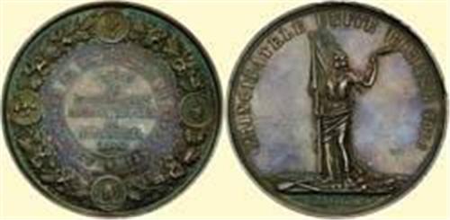 "GARDENING EXPOSITION IN BUCHAREST". Silver medal February 14th, 1866, 60 mm. Obv. Romania standing and facing, holding a branch and flag, "PRINCIPATELE UNITE ROMÂNE 1866""11 FEVRUARIE". Rv. Garland of vines and corn-ears; in center: "ONÓRE SI ÎNCURAGIARE AGRICULTUREI SI INDUSTRII 1866" around "EXPOSITIUNE DE ORTICULTURÂ ÎN BUCURESTI". Buz. p. 238