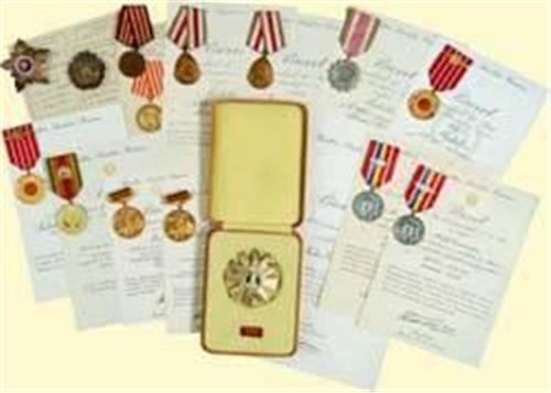 For Mr. Cernica: Order of "Tudor Vladimirescu" Order, 3rd class; Breast Badge, metal silvered, centre enamelled, with pin back in original box, together with the awarding document dated August 12th, 1974, with stamped signature of Nicolae Ceausescu.