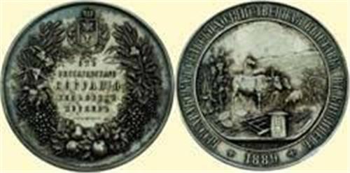 KISHINEV EXHIBITION OF BESSARABIAN VILLAGE COOPERATIVES". Silver medal 1889 by N. Stadnitzky, 53 mm. Obv. Garland with fruits and corn-ears, above the Moldavian coat-of-arms, in the centre "?G[ #+EE!C!#E7!’? E?#C!=3! E+9E73MW M?13!+%W" (From the Bessarabian Village Cooperatives). Rv. Rural landscape, around "#+EE!C!#E7!a E+9[E7?-M?1aE5G%+==!a %[yEG!%7! %[ 73S3=+%W * 1889 *" (Bessarabian Village Cooperatives Exhibition from Kishinev). Extremely rare!