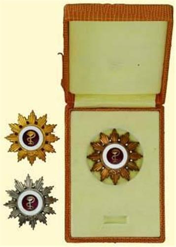 Complete set 1st - 3rd class; Breast Stars, 1st class copper gilt with red glass stones, 2nd class copper silvered with white glass stones, 3rd class copper with white glass stones in original box of issue; red enamelled centre medallion and pin back. Awarded between 1969 and 1989 for medical merit.