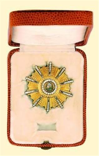 1st class, RSR, gold (61,30 g), hallmarked "worker with hammer" and maker's mark "MS" . Breast star with 10 rays, medallion enamelled, reverse with pin. Glass stones on the star and surrounding the medallion. In the center of the medallion the initials "RSR". In original luxury leather box. Awarded for the participation of civilian or military personnell in the military insurrection of August 23rd and merit in the labour movement. Perfect condition and of the highest rarity in gold !